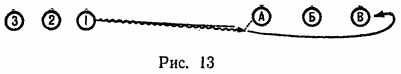«Челнок» регбистов. Игрок 1 бежит с мячом в руках до отметки, сделанной на поле, справа от него. Около отметки он совершает короткую передачу, а затем продолжает бег и пристраивается в конец колонны игроков. Игрок А, получив мяч, совершает те же действия, что и игрок 1 (рис. 13).