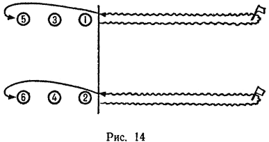 Эстафета с мячом. Упражнение заключается в следующем: первый игрок каждой колонны, владеющий мячом, по сигналу бежит в заданном направлении и передает мяч партнеру у сделанной на поле отметки. После этого он продолжает бег и располагается в конце колонны игроков (рис. 14). Упражнение носит развлекательный характер и может повторяться много раз без риска, что наскучит игрокам. На протяжении всего упражнения надо следить за правильным выполнением всех приемов владения мячом.