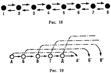 5. Передача с места вдоль линии. Игроки располагаются в две (или более) линии, мяч находится у игрока 1. Осуществляются последовательные передачи от первого (1) к последнему (8) игроку и обратно (рис. 18).