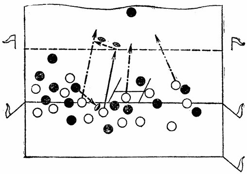 Рис. 30. Тактический вариант введения мяча в игру ударом из-за 22-метровой линии