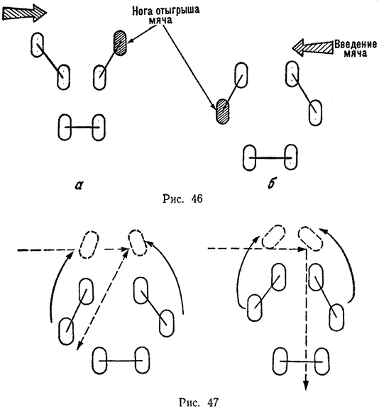 В представленных на рисунке вариантах игрок, находящийся в схватке со стороны, противоположной месту введения мяча, должен выполнять задачу отыгрыша мяча. Это осуществляется путем размещения дальней от вбрасывания ноги на траектории полета мяча (после того, как он коснулся земли в пространстве между игроками первой линии). Нога ставится на пятку, а ступня разворачивается в сторону мяча для отыгрыша его из схватки. В зависимости от величины угла, образованного ступней ноги и траекторией полета мяча, последний выйдет по одному из коридоров, образованных ногами игроков схватки (рис. 47).