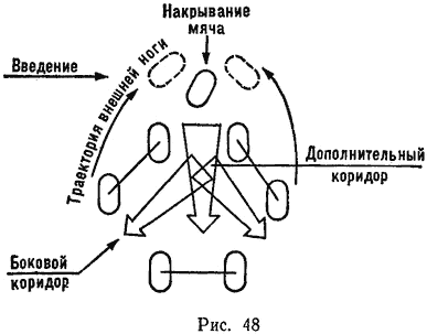 Выбор коридоров выхода мяча из схватки зависит от тактики команды, определяемой расположением соперника на поле (рис. 48).
