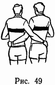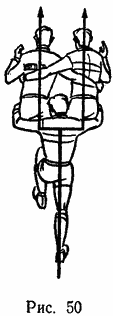 Игроки первой линии должны занимать в схватке следующее положение: внешняя нога полусогнута и немного сзади, спина прямая, голова в момент входа в схватку наклонена к груди. Игроки сцепляются руками, крепко обхватывая туловище партнера и опираясь на его бедро (рис. 49).