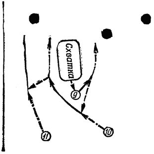 Однако не менее интересен в тактическом отношении вариант атаки «закрытой» стороной. Он особенно бывает удачным, если полузащитники № 9 и 10 используют прием передачи мяча так называемый «ножницы» (рис. 47).