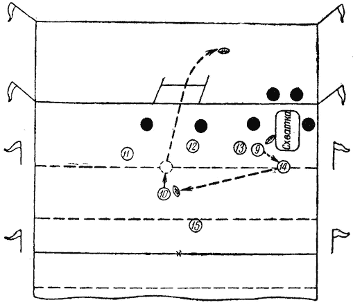 В случае такого построения защиты можно применить следующий маневр взятия ворот, а следовательно, и получения очков. Один из игроков атакующей команды располагается напротив ворот на расстоянии 25—30 м. На рис. 49 — это № 10. Схватка разыгрывается обычным образом. Как только полузащитник № 9 получает мяч из схватки, он не передает его на «открытую» сторону схватки, как наиболее вероятную для развития атаки, а наоборот, быстро передает своему трехчетвертному № 14. Этой передачей атакующая команда создает впечатление, что атака будет проводиться «закрытой» стороной усилиями трехчетвертного № 14. Вместе с передачей мяча трехчетвертному № 14 игроки атакующей команды перемещаются ближе к «закрытой» стороне, а следовательно, опекающие их защитники располагаются еще более плотно к своим подопечным (№ 11, 12, 13), немного выдвинувшимся вперед по отношению к полузащитнику № 10.