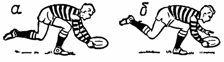 Рис. 9. Поднимание мяча, лежащего на земле и катящегося по земле: а) двумя руками; б) одной рукой