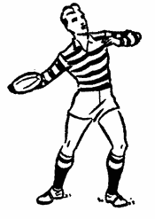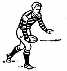 Передача с поперечным вращением. Мяч кладется вдоль руки, острой частью на ладонь, и бросается наподобие метания диска, но ладонь обращена в сторону полета мяча (рис. 11). Такой мяч летит далеко и сильно. Однако из-за того, что он кувыркается, его бывает трудно поймать.