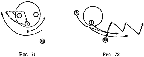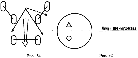 Для пояснения этой мысли на рис. 64 показаны основные (непрерывная линия) и дополнительные (пунктирная линия) коридоры, по которым мяч может выходить из схватки.