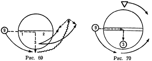 1. Игрок 9 после подбора мяча позади схватки устремляется к зачетному полю соперника и передает мяч игроку 3. Последний продолжает атаку, передавая мяч игрокам 1, 2 или 9. Нападающие могут выполнять короткие передачи друг другу с использованием защиты мяча от защитников телом, или так называемых «полуоборотов» (рис. 69).