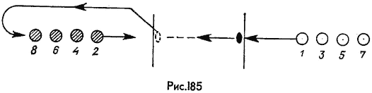 Упражнение похоже на предыдущее. После того как игрок обойдет тренера, он берет мяч в обе руки, проходит флажки (рис. 184) и по команде тренера отдает мяч налево или направо.