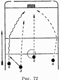 Можно применить и другой тактический прием. Противник обычно набирает скорость от своих ворот (если его не атакуют на его половине поля) и на пути движения наиболее выгодно выстраивается, т. е. организуется для перехода в зону нападения. Такое передвижение от своих ворот часто позволяет атакующей команде, двигаясь на большой скорости, легко обыграть защищающихся игроков в средней зоне и успешно атаковать ворота.