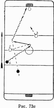 Это творчески, тактически разносторонний игрок, сочетающий в себе качества защитника и нападающего. Блуждающий защитник прежде всего должен выполнять свои основные защитные обязанности, когда же нападающие своей команды двигаются от ворот, он находится несколько сзади них и поддерживает атаку (рис. 72). Он как бы является связующим звеном между нападением и защитой. Больше того, блуждающий защитник всегда должен быть готов принять шайбу от партнеров с тем, чтобы самому участвовать в игре нападения и непосредственно атаковать ворота (рис. 73 а,б).