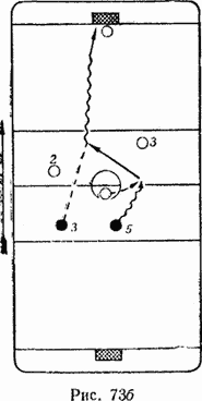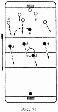 Поэтому, чтобы нарушить такое спокойное движение противника, предпринимают следующее (рис. 74): назад отходят не четыре, а три (Игрока, четвертый, как правило, нападающий 6, несколько задерживается в зоне нападения, «подстраивается» к движущемуся от ворот противнику 4 и по ходу атакует игрока, владеющего шайбой. Такое отбирание шайбы при атаке противника от чужих ворот в какой-то мере ограничит тактическое разнообразие атакующей команды и может исключить возникновение атаки.