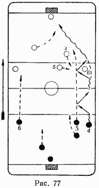 Например, набирая скорость от своих ворот, нападающие могут построиться следующим образом: два игрока катятся по одному краю рядом и передают друг другу шайбу, третий нападающий двигается по противоположному краю. Он несколько отстает от партнеров. Это делается потому, что двое нападающих могут потерять шайбу и их третий партнер должен будет успеть вернуться назад на помощь своим защитникам. Игроки стараются, используя большую набранную ими скорость, прорваться в зону и атаковать ворота противника. При этом для обыгрывания противника (рис. 77), который располагается у своей синей линии, два игрока используют быстрые короткие передачи или сильно бросают шайбу на другой фланг (рис. 78), если партнер 6 свободен. При этом два игрока, катясь на большой скорости, при встрече с противником могут обыграть его (передавая шайбу друг другу, посылая ее иногда под палку клюшки противника, между его ног) или ворваться в зону, сильно бросив предварительно шайбу в лицевой борт. Последний прием может быть применен особенно успешно, если за спиной нападающих противника плотно стоят защитники, которые не могут успеть подойти к шайбе, отскочившей от борта раньше. Такой бросок может быть выполнен и с расчетом на отскок шайбы от борта из-за ворот для того, чтобы ею овладел партнер, двигающийся по противоположной стороне поля.