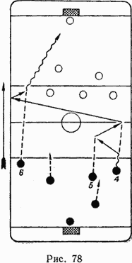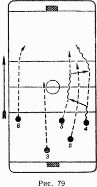 Такую скоростную атаку нападающих поддерживают защитники (рис. 79), особенно тот из них (защитник 2), на фланге которого двигаются два игрока. При такой атаке игроки действуют, придерживаясь своих мест.