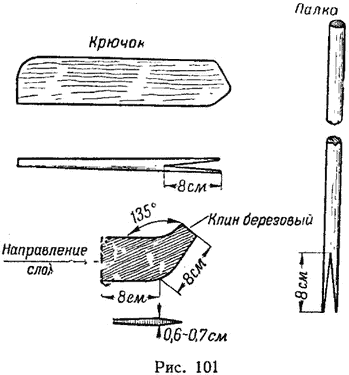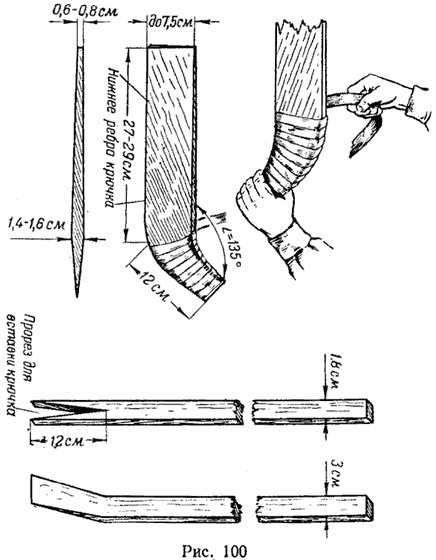 Клюшка состоит из палки с ручкой и крючка. Палка прямолинейного сечения 1,8 X 3 см. Плоский крючок вставлен в палку под тупым углом. Угол крючка может быть различным, в среднем он равен 135°; это зависит от привычек игрока. Ширина крючка не превышает 7,75 см, длина в среднем 27—29 см. Толщина крючка по нижней части у пятки 1,4—1,6 см, к концу крючка она уменьшается до 6—8 мм. Толщина крючка в верхней части уменьшается, как показано на рис. 100.