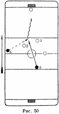 Если же игрок, владеющий шайбой, видит открытого партнера, который для развития атаки находится на более выгодной позиции, то должна последовать передача. На рис. 59 показан случай развития атаки в средней зоне, когда шайба правильно передается выдвинутому вперед хоккеисту. Если бы такой передачи не было, то игрок 4 вынужден был бы или занять стартовую позицию перед синей линией, или, замедлив бег, двигаться поперек поля. В обоих случаях действия такого хоккеиста были бы не только усложнены, ноги менее опасны для ворот противника, так как благоприятный момент для атаки был бы упущен.