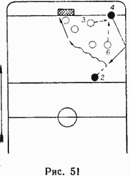 1. Броском о борт посылают шайбу на клюшку партнера, как бы «закрытого» противником (рис. 51).