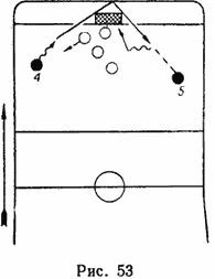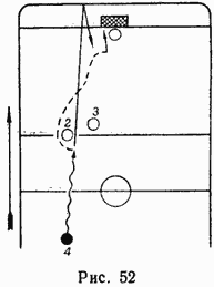 На рис. 52 игрок двигается к воротам с большой скоростью. Не добегая до противника, из средней зоны он неожиданно и сильно бросает шайбу в лицевой борт, обегает игроков противника, преграждающих путь туловищем, или перепрыгивает через их опущенные клюшки, раньше противника принимает шайбу и атакует ворота.