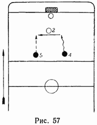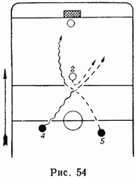 Применяют передачу шайбы и с оставлением ее на месте. Игрок пользуется такой передачей, когда его атакуют, а партнер находится в непосредственной близости. Хоккеист оставляет шайбу на месте и продолжает движение. Оставленную шайбу подхватывает партнер. Такая передача должна быть неожиданной для противника. Если оставленная игроком шайба будет неожиданно и быстро принята партнером, то защитник 2 (рис. 54), естественно, будет атаковать игрока 4, оставившего шайбу, а игрок 5 может свободно продвинуться с шайбой к воротам противника. Этот прием следует выполнять быстро, чтобы пауза между оставлением шайбы игроком и дальнейшим ведением (броском) ее партнером была как можно меньше. Такой передачей целесообразно пользоваться в зоне нападения для непосредственной угрозы воротам. Оставлять шайбу можно при скрещивающемся или встречном движении игроков или при движении в одном направлении.