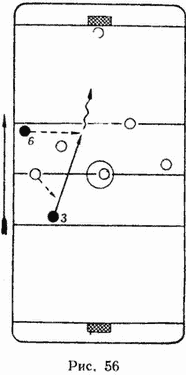 Если поперечная передача ведется на виду у обороняющихся игроков, т. е. перед ними, то при диагональной и продольной передачах игрок, получающий шайбу, подчас оказывается за спиной обороняющихся хоккеистов, которые не могут уловить подготовительных действий игрока. Это дезорганизует противника, так как большую часть внимания он обращает на игрока, владеющего шайбой. Продольной или диагональной передачами можно одновременно обыграть несколько игроков противника (рис. 56), значительно усложнив им организацию обороны. Диагональную и продольную передачи применяют при таком расположении, когда один или несколько игроков выдвинуты вперед по отношению к игроку, который владеет шайбой.
