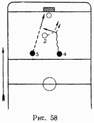 Однако и преждевременная передача также может не иметь успеха. Представим себе двух нападающих, двигающихся с большой скоростью к воротам противника (рис. 57). Один защитник — 2 — пытается отобрать у них шайбу. Он откатывается спиной вперед к своим воротам и старается клюшкой, не раскрывая своих намерений, выбить шайбу. Игрок 4, владеющий шайбой, не вступает в единоборство с защитником 2, а передает шайбу партнеру 5, который находится в менее выгодных условиях, нежели игрок 4, так как он должен, останавливая шайбу на большой скорости, быстро принять решение на виду и в непосредственной близости от защитника. Было бы правильнее игроку 4 заставить защитника 2 вступить с ним в единоборство, после чего отдать шайбу открытому партнеру, находящемуся перед воротами. Для этого он должен, например, помедлив с передачей, продвинуться несколько влево (рис. 58) и показать противнику, что он сам непосредственно будет угрожать воротам. Защитник 2 вынужден будет вступить в борьбу, пойдет на игрока 4 и, чтобы отобрать шайбу, может быть, применит игру туловищем. В этот момент и следует передать шайбу партнеру 5.