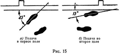 Плоскую «пушечную» подачу (рис. 16) целесообразно применять при первом мяче. Но малейшая неточность в ее выполнении ведет к тому, что теннисист не попадает мячом в поле подачи. Поэтому второй мяч лучше ввести в игру резаной или крученой подачей, которыми достигается большая точность.