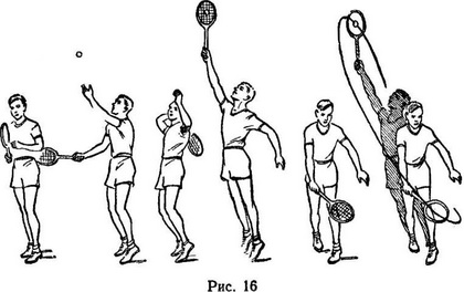 Выполняя «пушечную» подачу, Озеров становится у середины задней линии на расстоянии 5—8 см от нее, боком к сетке (рис. 15). Ноги — на ширине плеч, вес тела равномерно распределен на обе ноги. Руки полусогнуты на уровне пояса. Правая рука с ракеткой начинает замах, двигаясь вверх-назад, делает петлю за спиной и резким движением производит удар по мячу. Одновременно с началом движения ракетки левая рука подкидывает мяч. Мяч Озеров подбрасывает над левым плечом, немного вперед к сетке, на уровень, на котором производит удар. Он бьет мяч в так называемой «мертвой точке». Если мяч будет подкинут выше точки удара, то подающему труднее будет точно серединой ракетки попасть по быстро опускающемуся мячу. Если мяч будет подкинут низко, то игрок вынужден будет при ударе согнуть руку. И в том и в другом случаях сила удара и точность уменьшатся. Движение ракетки у Озерова при подаче непрерывно. Медленнее при замахе, оно постепенно убыстряется, достигая наивысшей скорости к моменту соприкосновения с мячом.