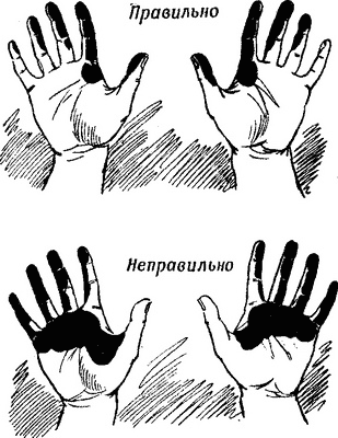 Рис. 19. Следы на ладонях рук от правильного (вверху) и неправильного (внизу) приема запачканного сажей мяча