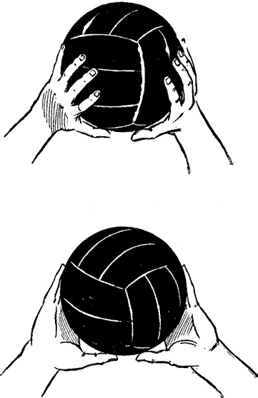 II. Пальцы должны соприкасаться с мячом на уровне верхней части лица игрока. Это обеспечивает большую точность передач в любом направлении, и выполнить их можно более скрытно. Если соприкосновение руке мячом происходит выше головы, то возможны ошибки: броски, мяч «срывается» с рук.
